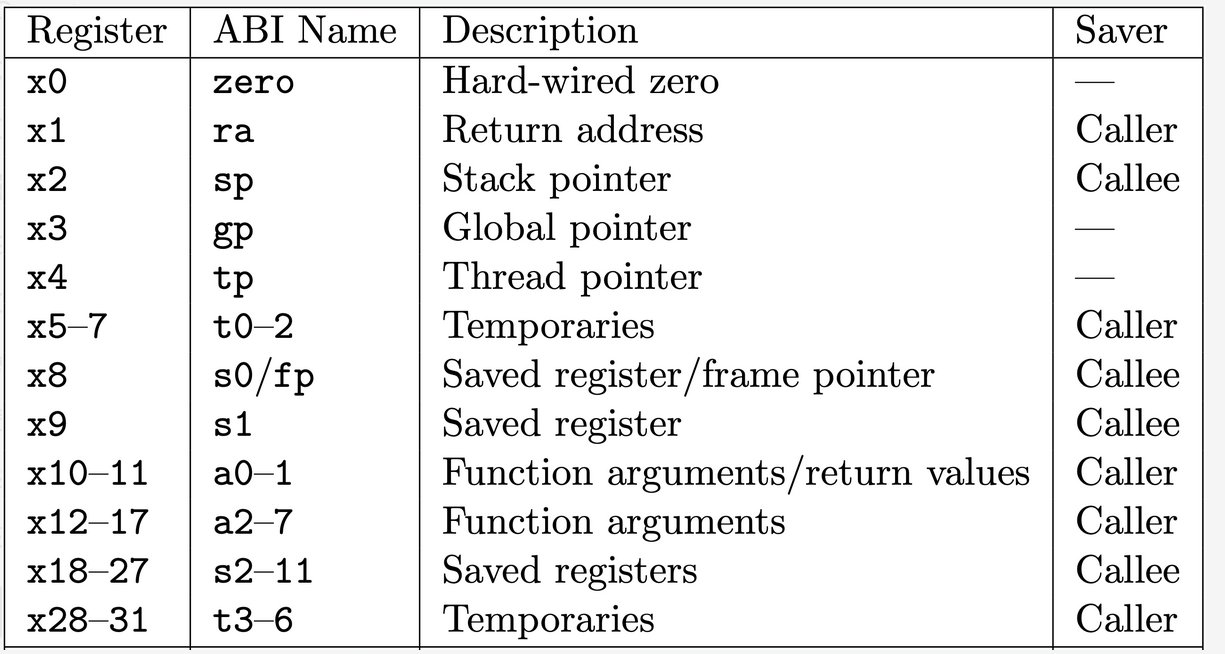 x0=zero— always zerox1=ra— return addressx2=sp— stack pointerx3=gp— global pointerx4=tp— thread pointerx5–x7=t0–t2— temporary registersx8–x9=s0–s1— saved registersx10–x17=a0–a7— function arguments and return valuesx18–x27=s2–s11— saved registersx28–x31=t3–t6— temporary registers